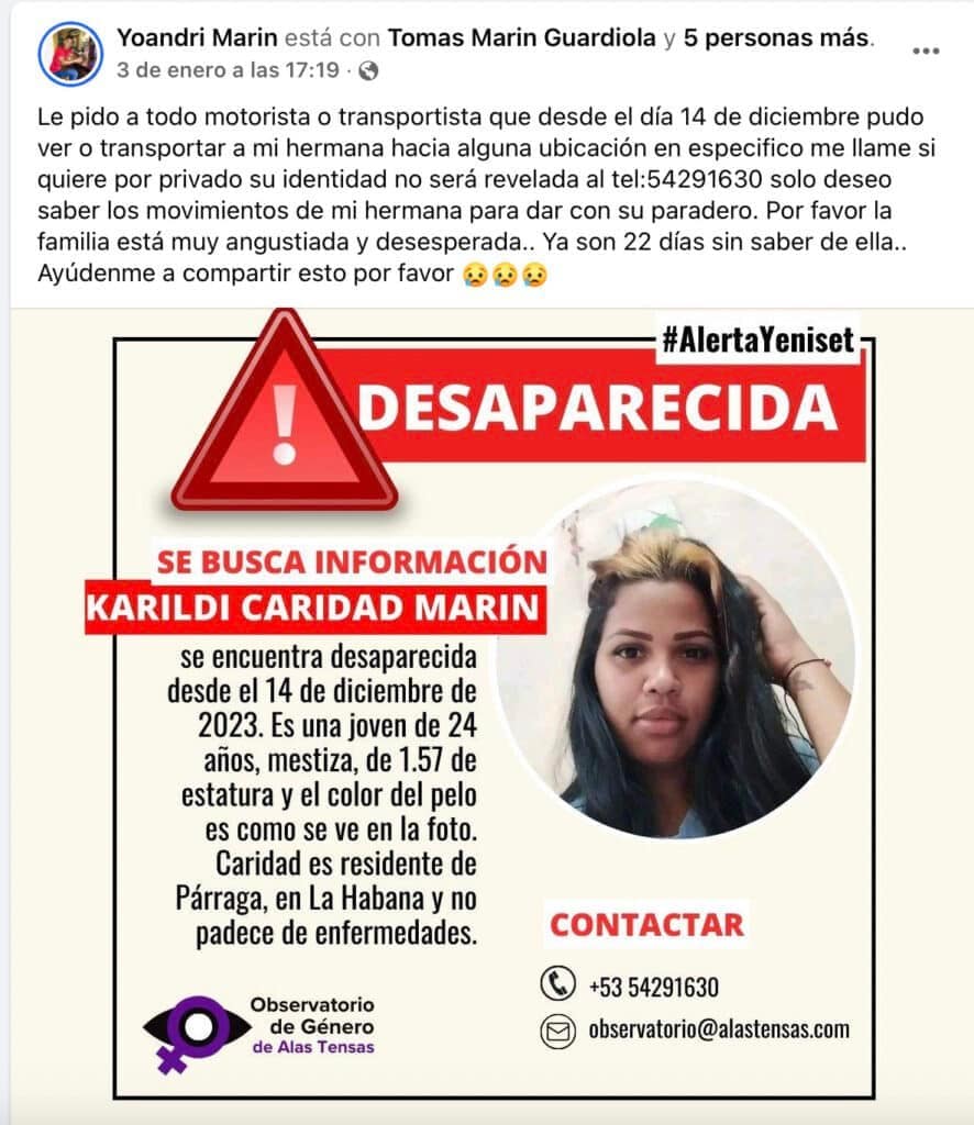 «Mi hermana salió el jueves por la noche a una fiesta creo que por El Cerro y hasta hoy no ha mandado ni un mensaje, ni ha hecho una llamada, y todos estamos muy preocupados porque no acostumbra a estar sin llamarnos tantos días», escribió Yoandri Marín, su hermano, en su perfil de Facebook seis días después de su desaparición.